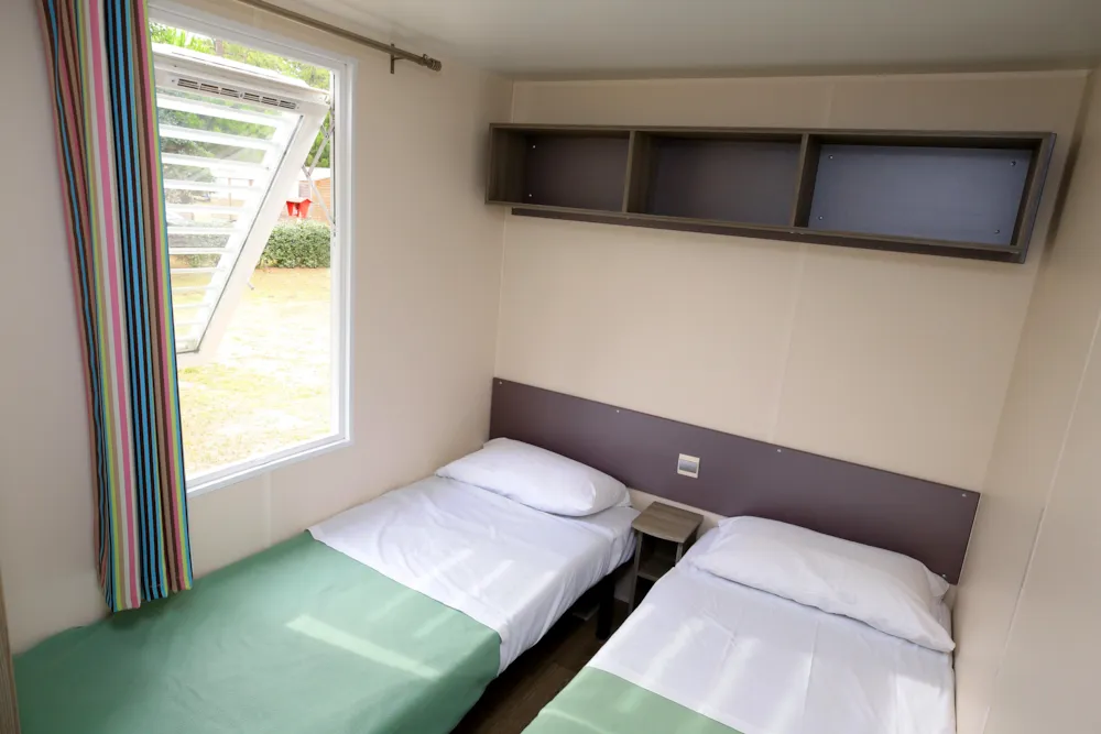 > 1 chambre avec lit double en 140 x 190, 1 chambre avec 2 lits simples 80 x 190. Banquette convertible en 120 x 190 dans le séjour pour couchage supplémentaire.