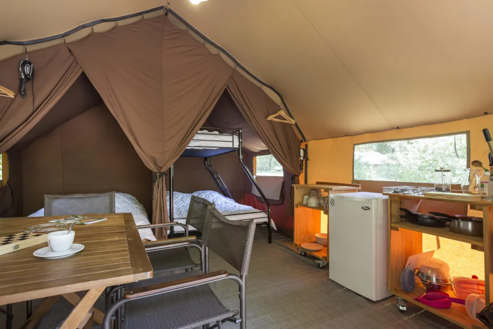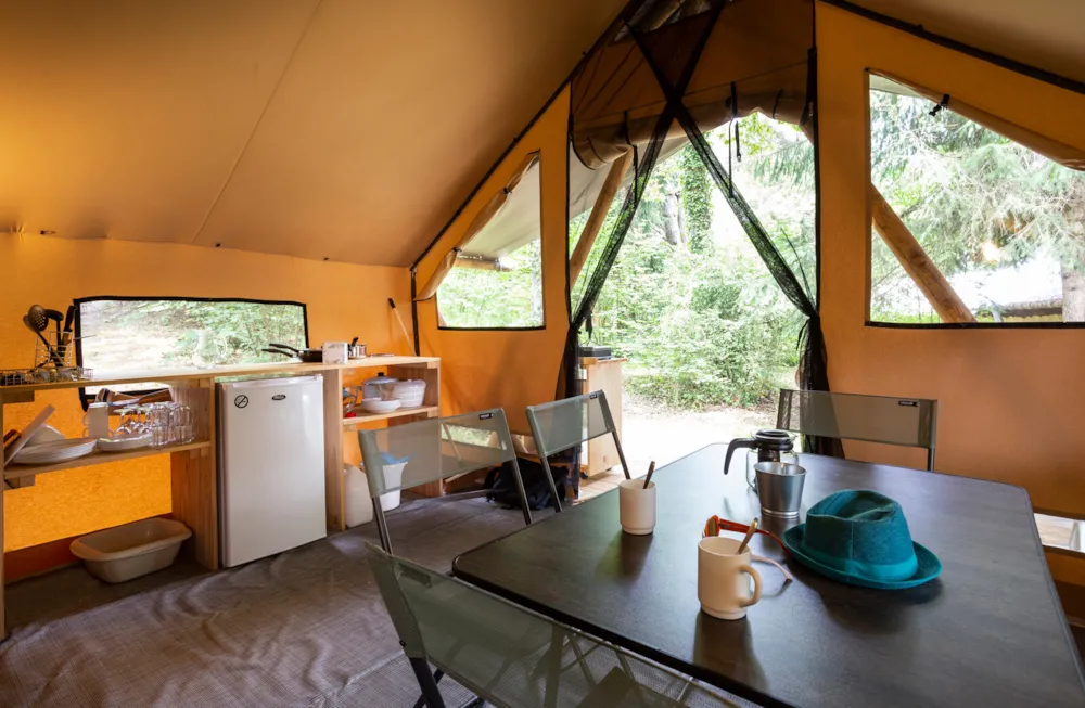 Se réveiller au souffle du vent dans les arbres …Pièce commune avec coin cuisine (réchaud gaz 2 feux, réfrigérateur, vaisselle, rangements, table, fauteuils et chaises, lanternes…).Espace nuit avec : côté parents un lit double 140×200 et côté enfants un lit double 140×190 superposé d’1 lit simple 90×190.Extérieur : terrasse en bois, parasol, 2 fauteuils pop-up.