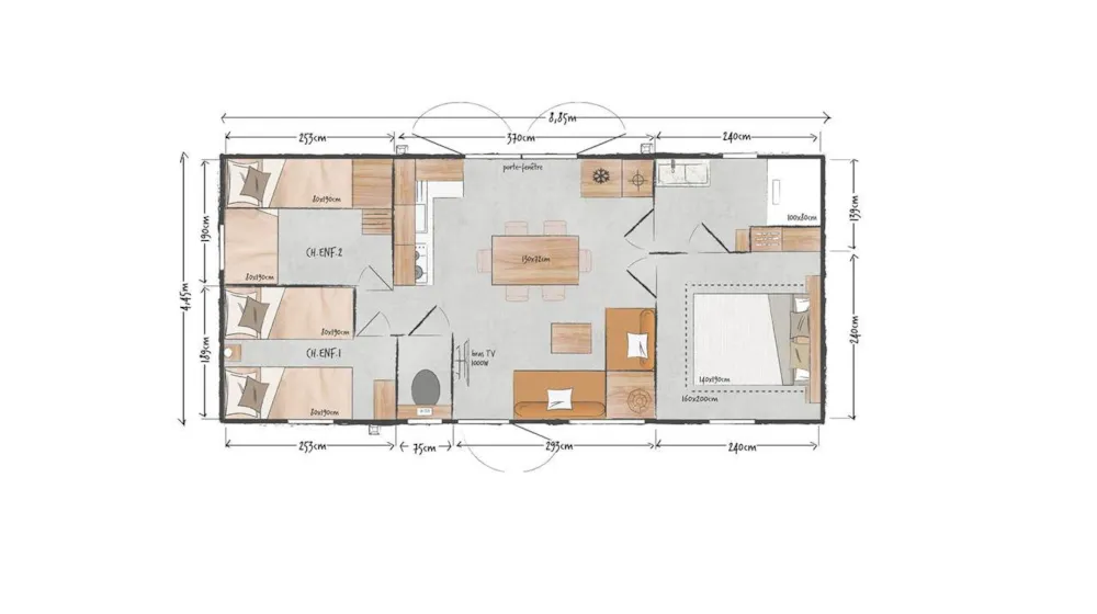 Idéal pour les familles recomposées, ce mobilhome avec ses 3 chambres ( 1 lit double et 4 lits simples) offre une intimité très appréciée. Les lits sont prêts pour votre arrivée, et vous disposez d'une connexion wifi de votre mobilhome. Une jolie terrasse avec un barbecue pour Monsieur, quoi de mieux pour les vacances. Ce mobilhome est climatisé.